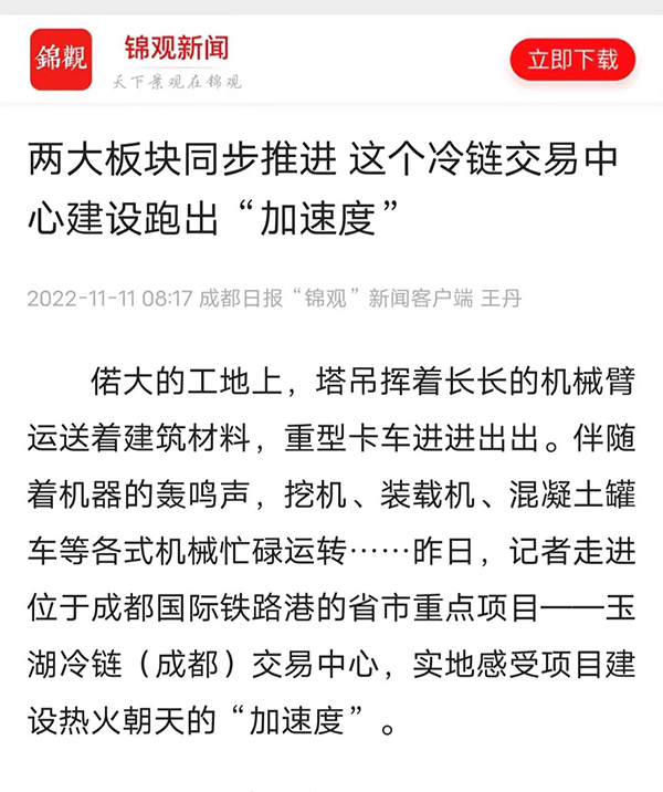 全力以赴抓建設,穩住經濟基本盤。近期,成都日報推出「拚經濟搞建設抓發展」專欄,關注重點項目進展。11月11日,該欄目報道了91视频下载安装冷鏈(成都)交易中心項目建設情況,四川91视频成人免费版網等轉載,引起廣泛關注。