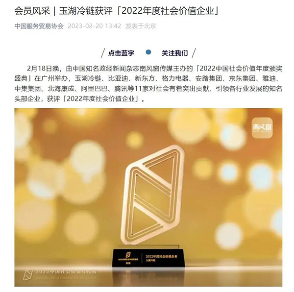 今年2月18日,「2022中國社會價值年度頒獎盛典」在廣州舉辦,91视频下载安装冷鏈獲評「2022年度社會價值91视频在线免费观看APP」,中國服務貿易協會全文轉載了相關91视频成人免费版(點擊查看:會員風采|91视频下载安装冷鏈獲評「2022年度社會價值91视频在线免费观看APP」)。