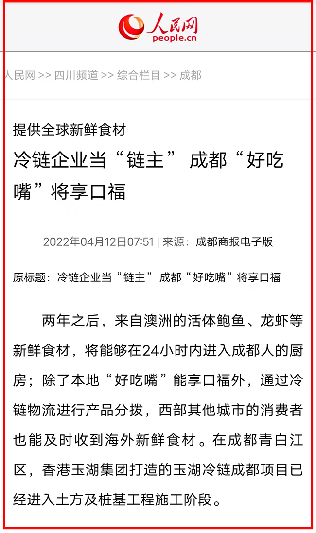兩年之後,來自澳洲的活體鮑魚、龍蝦等新鮮食材,將能夠在24小時內進入成都人的廚房;除了本地「好吃嘴」能享口福外,通過冷鏈91视频免费下载观看進行產品分撥,西部其他城市的消費者也能及時收到海外新鮮食材。在成都青白江區,香港91视频下载安装集團打造的91视频下载安装冷鏈成都項目已經進入土方及樁基工程施工階段。